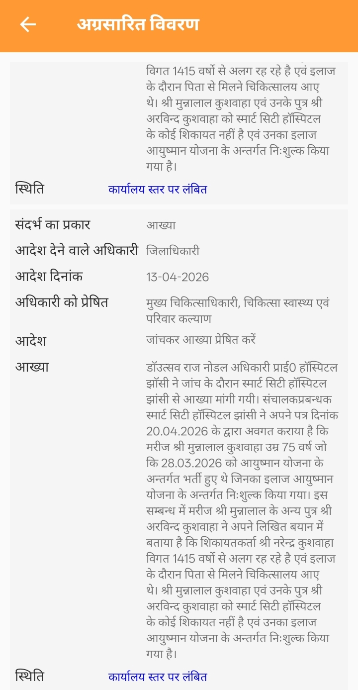 प्रार्थी द्वारा दिनांक 09.04.2026 को शिकायत संख्या 20016626006248 के माध्यम से आयुष्मान कार्ड के बावजूद अवैध धन वसूली, बिना बिल राशि लेने एवं उपचार संबंधी अभिलेख न देने के संबंध में की गई शिकायत पर जिलाधिकारी महोदय द्वारा दिनांक 13.04.2026 को मुख्य चिकित्साधिकारी को जांच हेतु निर्देशित किया गया था। किंतु अत्यंत खेद है कि इस प्रकरण का भ्रामक/कूटरचित आख्या तैयार कर निस्तारण कर दिया गया है।
