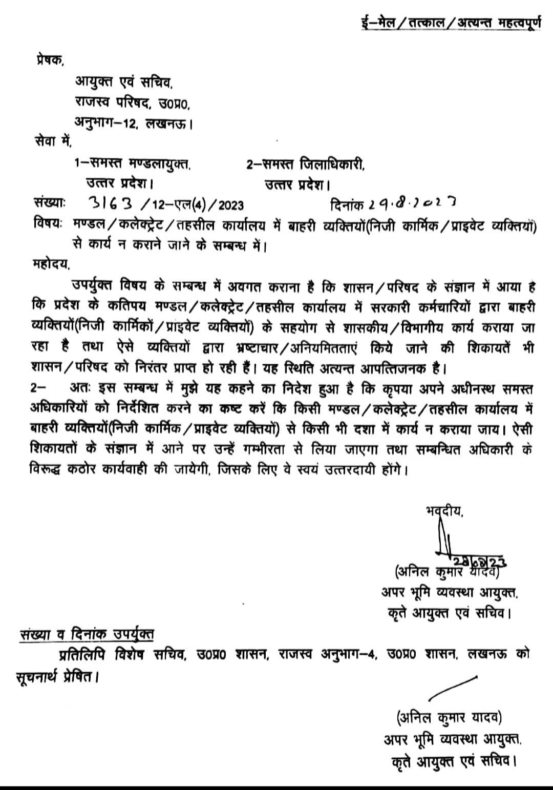 गरौठा झाँसी, तहसील प्रशासन द्वारा उत्तंर प्रदेश सरकार के आदेशों की उड़ाई जा रही हैं धज्जियाँ तहसील गरौठा में तहसीलदार ललित कुमार पाण्डेय द्वारा कुछ दिनों पूर्व शासन द्वारा दिये गये दिनांक 29.08.2023 के आदेशानुसार तहसील गरौठा में कार्य करने वाले समस्त प्राईवेट कर्मचारियों को बाहर का रास्ता दिखा दिया था, लेकिन तहसीलदार महोदय का स्थानान्तरण तहसील गरौठा से झॉसी सदर हो जाने के बाद प्राईवेट कमचारियों की लॉटरी ही लग गई तहसील गरौठा में फिर से खेला जा रहा है दलाली का खेल, तहसील प्रशासन के आला अधिकारी मौन आखिर क्या वजह है कि तहसील गरौठा के अधिकारियों द्वारा प्राईवेट कर्मचारियों के विरूद्व कोई भी कार्यवाही नहीं की जा रही है। जबकि प्रदेश सरकार द्वारा कहा गया है कि किसी भी प्राईवेट कर्मचारी से कोई भी सरकारी कार्य न कराया जाय। फिर भी तहसील गरौठा में प्राईवेट कमचारियों से कराया जा रहा है कार्य खुलेआम जरिये प्राईवेट कमचारियों के फल फूल रहा है दलाली का कारोबार इससे ऐसा प्रतीत होता है कि इस खेल में प्रशासनिक अधिकारी भी सामिल हैं।