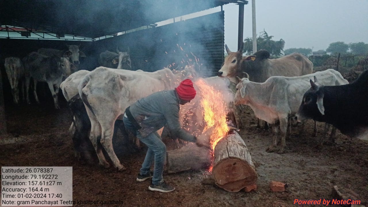 *तस्वीरों में साफ देखा जा सकता है कि नदीगांव विकासखंड” के ग्राम पंचायत तीतरा खलीलपुर में सर्द रातों में ग्राम प्रधान प्रतिनिधि प्रवीण परिहार व गौशाला केयर टेकर कल्लू बाल्मिकी के साथ कर रहे व्यवस्था।*