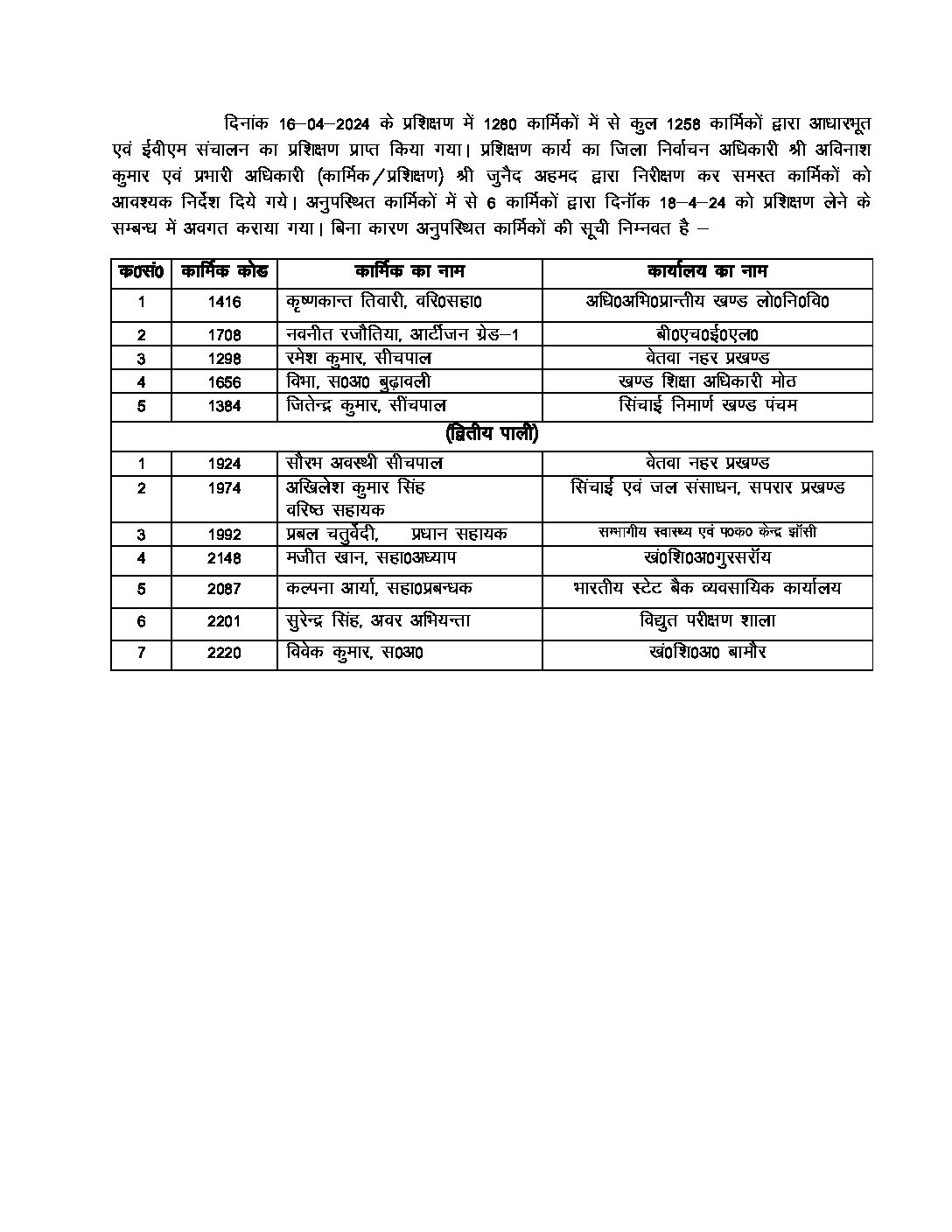 बिना कारण के अनुपस्थित रहने वाले कार्मिकों में कृष्णकान्त तिवारी, वरि०सहा0, नवनीत रजौतिया, आर्टीजन ग्रेड-1, रमेश कुमार, सीचपाल, विभा स0अ0 बुढावली, जितेन्द्र कुमार, सींचपाल तथा द्वितीय पाली में