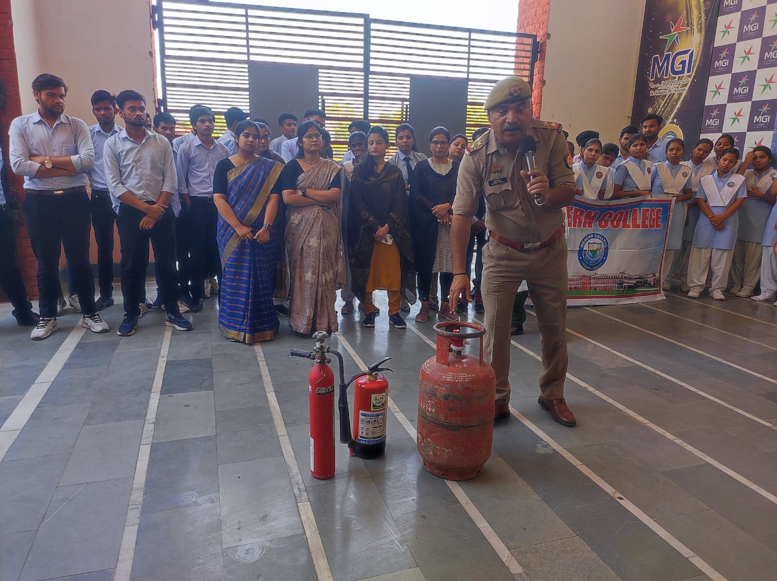 शासन के द्वारा 14 अप्रैल से 20 अप्रैल 2024 तक प्रदेश में उ0प्र0 अग्निशमन सेवा सप्ताह मनाया जा रहा है। जिसके अंतर्गत विभिन्न महाविद्यालयों में छात्र-छात्राओं को जागरूक किया जा रहा है। इसी क्रम में आज माॅडर्न कॉलेज में भी जागरूकता कार्यक्रम आयोजित किया गया। जिसमें मुख्य अग्निशमन अधिकारी राजकिशोर राय व उनकी टीम नें छात्र-छात्राओं को आग लगने के कारण व आपात स्थिति में आग पर काबू पाने के विभिन्न तरीके बताये। एल0पी0जी0 सिलेंडर में लगी आग पर काबू पाने के लिए अग्निशामक यंत्रों का प्रयोग करना व बिना यंत्रों के भी आग पर काबू पाना सिखाया। अनेक छात्र-छात्राओं ने खुद आग को यंत्रों व बिना यंत्र के बुता कर देखा। माॅडर्न महाविद्यालय प्राचार्य नरेन्द्र कुमार त्रिपाठी ने कहा कि आपात स्थिति में घबराये न और हिम्मत से आग पर नियंत्रण पाये। माॅर्डन काॅलेज प्राचार्य डा0 असद अहमद ने सभी छात्र-छात्राओं को सर्तक व जागरूक रहने के लिए प्रेरित किया और उ0प्र0 अग्निषमन टीम का आभार व्यक्त किया। इस मौके पर प्रवक्ता अभिशेक पुरोहित, हर्शवर्धन, हृदयेष कुमार विष्वकर्मा, अतुल पटैरिया, सुभाश यादव, सुरेन्द्र कुमार, इन्दिरा मिश्रा, निधि श्रीवास्तव, दीक्षा तिवारी, करिषम अग्रवाल, मिथलेष कुमारी, राजकुार गौतम, चन्द्रषेखर विष्वकर्मा, नितांषु षुक्ला, आषीश सोनी, राजकुमार आर्या, अभय सिंह, सुनील रयकवार एवं केषव गौतम साहित समस्त टीचिंग एवं नाॅन टीचिंग स्टाफ उपस्थित रहा।