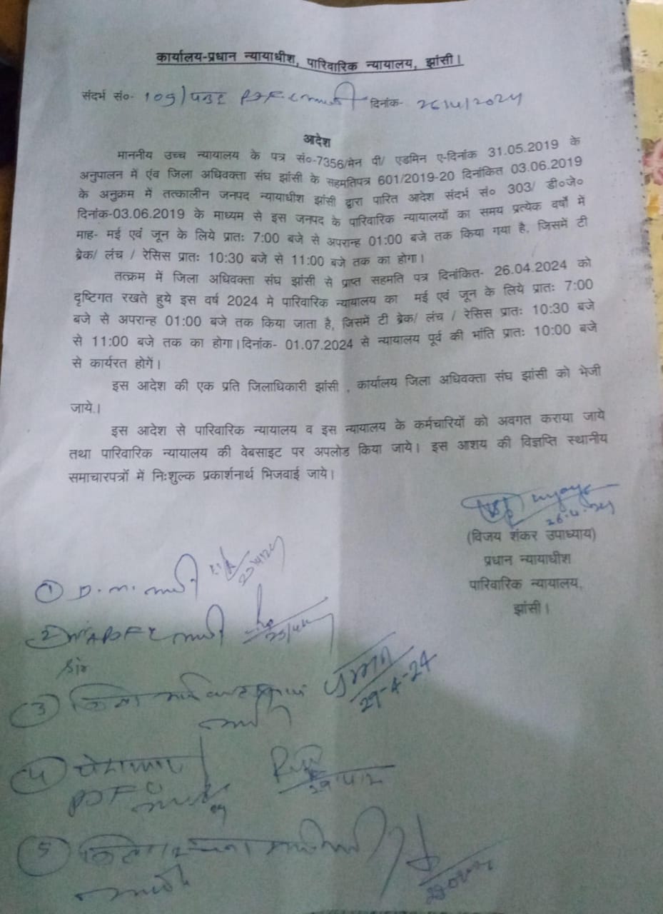 तत्क्रम में जिला अधिवक्ता संघ झांसी से प्राप्त सहमति पत्र दिनांकित- 26.04.2024 को दृष्टिगत रखते हुये इस वर्ष 2024 में पारिवारिक न्यायालय का मई एवं जून के लिये प्रातः 7:00 बजे से अपरान्ह 01:00 बजे तक किया जाता है, जिसमें टी ब्रेक लंच / रेसिस प्रातः 10:30 बजे से 11:00 बजे तक का होगा। दिनांक- 01.07.2024 से न्यायालय पूर्व की भांति प्रातः 10:00 बजे से कार्यरत होगें।