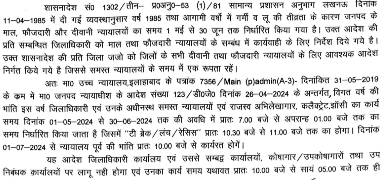 झाँसी, जिलाधिकारी द्वारा अवगत कराया गया कि आगामी वर्षों में गर्मी व लू की तीव्रता के कारण जनपद के माल, फौजदारी और दीवानी न्यायालयों का समय 1 मई से 30 जून तक निर्धारित किया गया है। जिलों के सभी दीवानी तथा फौजदारी न्यायालयों के लिए आवश्यक आदेश निर्गत किये गये है जिससे समस्त न्यायालयों के समय में एक रूपता रहें । मा० उच्च न्यायालय, इलाहाबाद के पत्रांक 7356/Main (p) admin (A-3)- दिनांकित 31-05-2019 के क्रम में मा० जनपद न्यायाधीश के आदेश संख्या 123/डी0जे0 दिनांक 26-04-2024 के अन्तर्गत, विगत वर्ष की भांति इस वर्ष जिलाधिकारी एवं उनके अधीनस्थ समस्त न्यायालयों एवं राजस्व अभिलेखागार, कलैक्ट्रेट, झॉसी का कार्य समय दिनांक 01-05-2024 से 30-06-2024 तक की अवधि में प्रातः 7.00 बजे से अपरान्ह 01.00 बजे तक का समय निर्धारित किया जाता है जिसमें “टी ब्रेक / लंच / रेसिस प्रातः 10.30 बजे से 11.00 बजे तक का होगा। दिनांक 01-07-2024 से न्यायालय पूर्व की भांति प्रातः 10.00 बजे से कार्यरत होगें । यह आदेश जिलाधिकारी कार्यालय एवं उससे सम्बद्ध कार्यालयों, कोषागार / उपकोषागारों तथा उप निबंधक कार्यालयों पर लागू नहीं होगा एवं उनका कार्य समय यथावत प्रातः 10.00 बजे से सायं 05.00 बजे तक ही रहेगा ।
