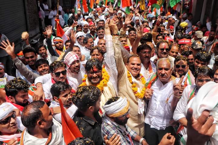 जुलूस का जगह जगह प्रदीप जैन को माला पहनाकर लोगों ने स्वागत किया ओर पुष्पवर्षा की।