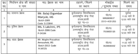 सामान्य प्रेक्षक Balaji Digambar Manjule, IAS Batch-2009 Code G-22844 के ठहरने/मिलने का स्थानबुन्देलखण्ड विश्वविधालय अन्तराष्ट्रीय केन्द्र गेस्ट हाउस, झांसी सूट नं0-01 है । मा0 सामान्य प्रेक्षक जी के मो०नं० 9559865507 0510-4051253 व मिलने का समय पूर्वान्ह 11.00 बजे से 12.00 बजे तक है।