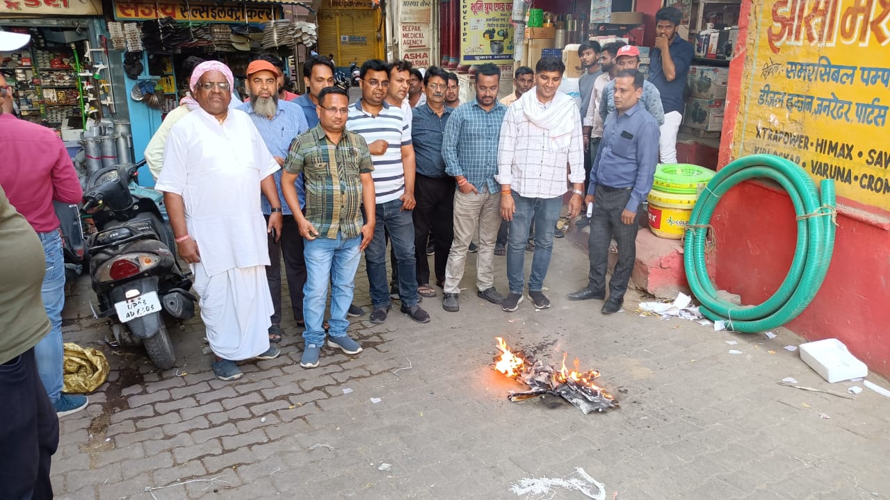 बताया गया कि व्यापार मंडल के अध्यक्ष संजय एवं ऋषभ अग्रवाल द्वारा एक कंपनी मानवी बिल टैक बनाई गई है। इनके द्वारा सुभाष जैन उनकी पत्नी मंजू जैन से उनकी संपत्ति को खरीदते है और उसमें तीन मंजिल मार्केट का निर्माण करते है। इसके बाद न्यू रोड व्यापारियों को यह कहकर बेच देते हैं की समस्त संपत्ति में किसी प्रकार का कोई विवाद नहीं है और न ही कोई बैंक का कोई बकाया है। व्यापार मंडल के अध्यक्ष होने के नाते सभी व्यापारियों ने इनकी बातों पर विश्वास कर लिया और संपत्ति को खरीद लिया। वर्ष 2023 में बैंक मैनेजर व्यापारियों के पास आते हैं और बताते हैं कि उक्त संपत्ति पर 30 लाख का कर्ज है। इसके बाद संजय अग्रवाल ने कहा कि वे पूरा कर्ज भरेंगे। अभी कुछ समय पूर्व संजय अग्रवाल ने व्यापारियों से कहा कि भी किसी प्रकार का कोई कर्ज नहीं भरेंगे। इसके बाद सारे व्यापारियों ने डीआईजी पुलिस को प्रार्थना पत्र दिया। इसकी बात पुलिस ने आरोपी व्यापारी नेता पर 420, 406 धारा के अंतर्गत केस दर्ज कराया। केस दर्ज होने के बाद उक्त व्यापारी नेता पर पुलिस द्वारा गिरफ्तारी कार्रवाई नहीं की जा रही है। इससे सभी व्यापारी नाराज हैं। शुक्रवार को सभी व्यापारियों ने उक्त व्यापारी नेता का पुतला दहन कर अपना आक्रोश व्यक्त किया। साथ ही प्रशासन से मांग की है कि जल्द ही उन्हें न्याय दिलाए जाए। इस दौरान सुदीप अग्रवाल, नितिन चावला, अंकुर अग्रवाल, अजीत यादव, महेश गोस्वामी, नईम खान, विश्व मोहन अग्रवाल, अभिषेक चऊदा, नीरज अग्रवाल, अनुराधा अग्रवाल, माधुरी जैन, आशा अग्रवाल, मांडवी गुप्ता, प्रेम नारायण गुप्ता आदि लोग उपस्थित रहे।