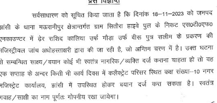 झाँसी,नगर मजिस्ट्रेट विधेश द्वारा सर्वसाधारण को सूचित किया गया है कि दिनांक 18-11-2023 को जनपद झांसी के थाना मऊरानीपुर क्षेत्रान्तर्गत ग्राम सितौरा हाइवे पुल के निकट एस०टी०एफ० एनकाउण्टर में ढेर राशिद कालिया उर्फ गौड़ा उर्फ वीरू पुत्र सलीम के प्रकरण की मजिस्ट्रीयल जांच अधोहस्ताक्षरी द्वारा की जा रही है, जो अन्तिम चरण में है।