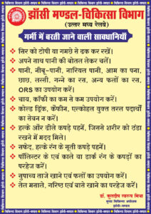 इस सम्बन्ध में चिकित्सा विभाग झाँसी मण्डल के समस्त कर्मचारियों व उनके परिवार को गर्मी में बरती जाने वाली सावधानियों बावत् एक पोस्टर / स्टीकर बनवाया गया, जिसे मण्डल के सभी कार्य स्थलों, सभी रेलवे स्टेशनों व सभी रेलवे कॉलोनियों में चस्पा करने का कार्य किया गया ताकि मण्डल के सभी रेल कर्मचारी व उनके परिवाजन उक्त पर अमल कर लू से बच सके।