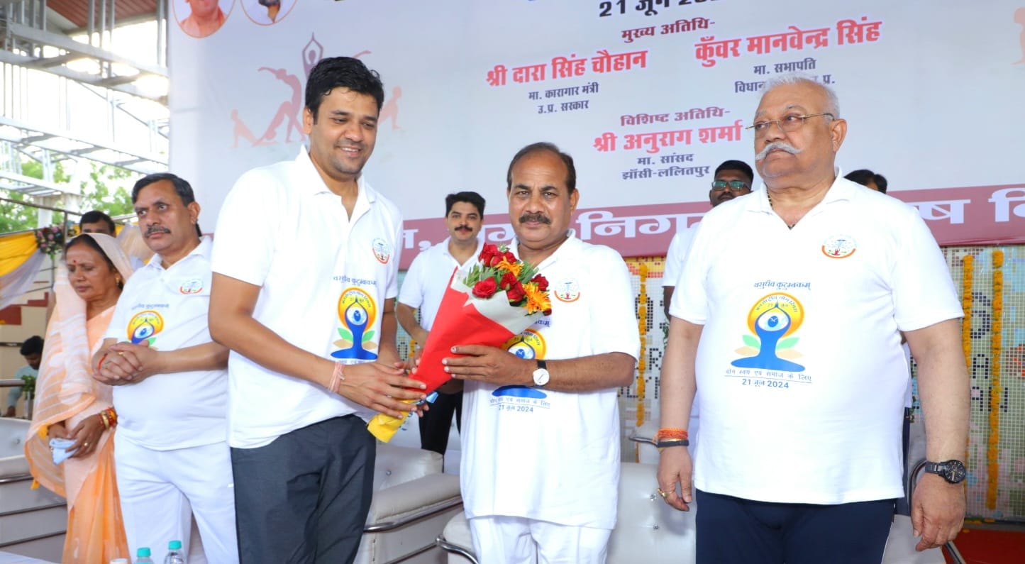 इसी क्रम में आज जनपद झांसी में भी योग दिवस को भव्य तरीके से मनाया गया। जनपद के विभिन्न भागों में योग कार्यक्रमों का आयोजन किया गया। मुख्य कार्यक्रम मेजर ध्यान चंद स्टेडियम में आयोजित किया गया। इस कार्यक्रम में मुख्य अतिथि के रूप में माननीय सभापति विधान परिषद उत्तर प्रदेश कुंवर मानवेंद्र सिंह एवं कारागार मंत्री उत्तर प्रदेश सरकार दारा सिंह चौहान की उपस्थित में हुआ।