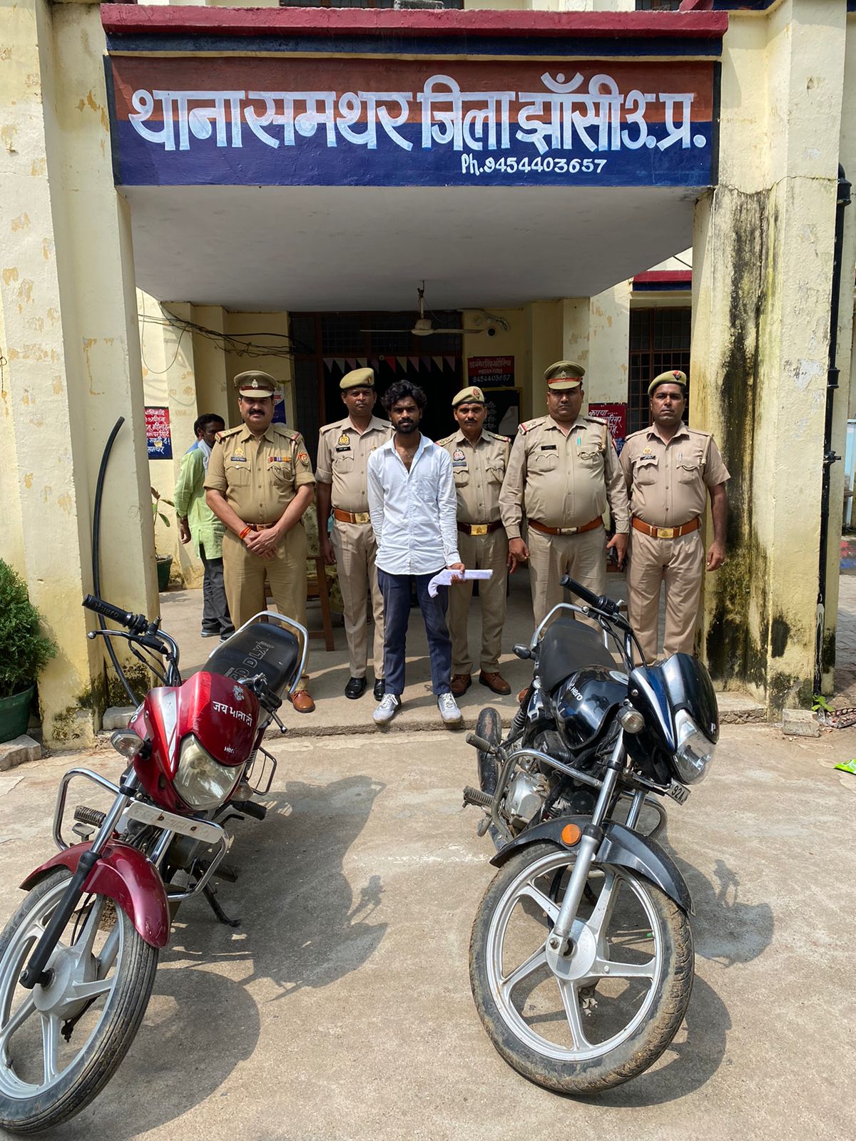 झांसी कस्बा समथर वरिष्ठ पुलिस अधीक्षक झाँसी सुधा सिंह व पुलिस अधीक्षक ग्रामीण के कुशल निर्देशन व क्षेत्राधिकारी मोठ के पर्यवेक्षण में थानाध्यक्ष अजमेर सिंह भदौरिया द्वारा गठित टीम द्वारा चेकिंग संदिग्ध व्यक्ति वाहन मे दबोह तिराहा से सजोखरी गाँव की तरफ से अभियुक्त मोहित कुमार बाल्मीक पुत्र राजू कुमार बाल्मीक निवासी मु० हरीपुरा थाना कोतवाली जालौन जनपद जालौन उम्र करीब 20 वर्ष के कब्जे से के 02 अदद चोरी की मो०सा० व 01 अदद तमंचा 12 बोर व 02 अदद जिन्दा कारतूस 12 बोर बरामद हुये। जिसके सम्बंध में अभियुक्त के विरूद्ध थाना हाजा पर मु0अ0स0 158/24 धारा 317(2) (4)/318(4) बीएनएस व 3/25 आर्म्स एक्ट पंजीकृत किया गया। बरामद 02 अदद मो०सा० आस-पास झाँसी-जालौन के क्षेत्र से चोरी की गयी जिनके सम्बंध मे जानकारी कर विधि अनुरूप कार्यवाही की जा रही है। अभियुक्त उपरोक्त को माननीय न्यायालय के समक्ष पेश करने हेतु भेजा जा रहा है अभियुक्त गण का नाम व पता मोहित कुमार बाल्मीक पुत्र राजू कुमार बाल्मीक निवासी मु० हरीपुरा थाना कोतवाली जालौन जनपद जालौन उम्र करीब 20 वर्ष अभियुक्त मोहित का अपराधिक इतिहास मु0अ0स0 106/18 धारा 379/411 IPC कोतवाली जालौन जनपद जालौन मु0अ0स0 158/19 धारा 3/25 आर्म्स एक्ट कोतवाली मु0अ0स0 23/23 धारा 302/364/147/34/120बी भादवि थाना डकोर जालौन मु0अ0स0 119/23 धारा 302/364/147/34/120बी भादवि थाना डकोर जालौन मु0अ0स0 158/24 धारा 317 (2) (4) / 318 (4) बीएनएस थाना समथर जनपद झाँसी गिरफ्तार करने वाली थाना पुलिस टीम अजमेर सिंह भदौरिया थानाध्यक्ष उ0नि0 मिथलेश कुमार उ0नि0 राजकिशोर हे0का0 334 जुबैर आलम का0 215 प्रदुम्न शुक्ला का0 22 आलोक कटियार थाना समथर।