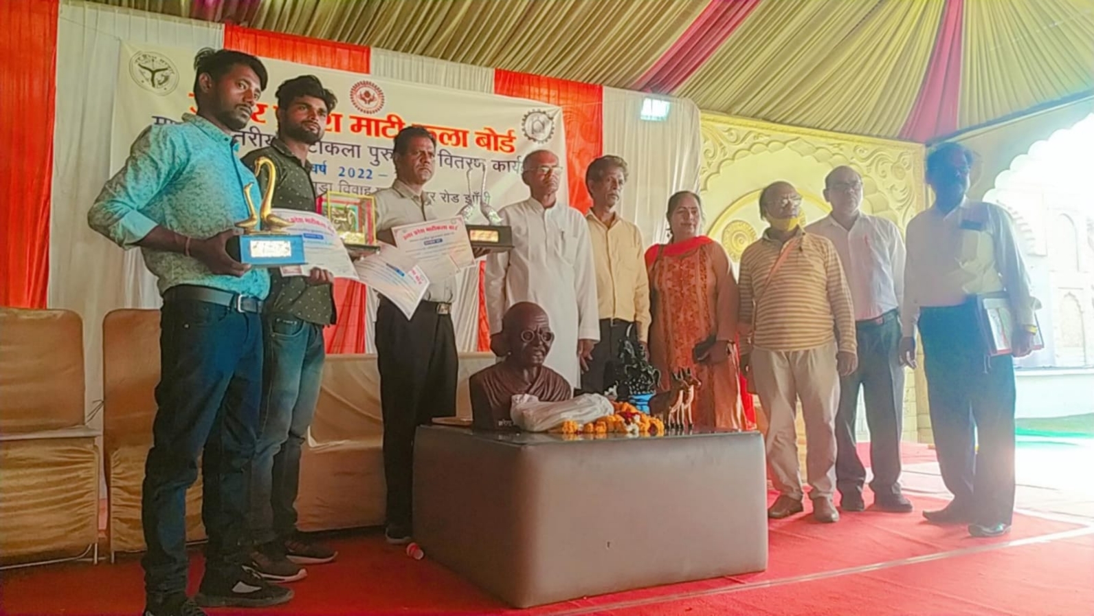 जनपद झांसी के ग्रामीण एवं नगरीय क्षेत्रों में प्रजापति समाज के परम्परागत कारीगरों द्वारा माटीकला एवं माटी शिल्पकला का कार्य करने वाले शिल्पियों / कारीगरों / उद्यमियों को उनकी श्रेष्ठ कृतियों के चयन समिति द्वारा अवलोकन एवं चयन के आधार पर वर्ष 2022-23 में मण्डल स्तर पर प्रथम, द्वितीय एवं तृतीय कुल 3 पुरस्कार दिये जाने हेतु उ०प्र० माटीकला बोर्ड लखनऊ द्वारा पुरस्कार वितरण का आयोजन रजवाडा विवाहघर कानपुर रोड झांसी में किया गया, तथा उoप्रo माटीकला बोर्ड द्वारा संचालित दिया मेकिंग मशीन (निःशुल्क) वितरण योजना के अन्तर्गत दिनांक 28.03.2023 को नरेन्द्र प्रताप प्रजापति, सदस्य, उ०प्र०माटीकला बोर्ड, लखनऊ के कर कमलों द्वारा पुरस्कार एवं दिया मेकिंग मशीन (निःशुल्क) का वितरण किया गया।