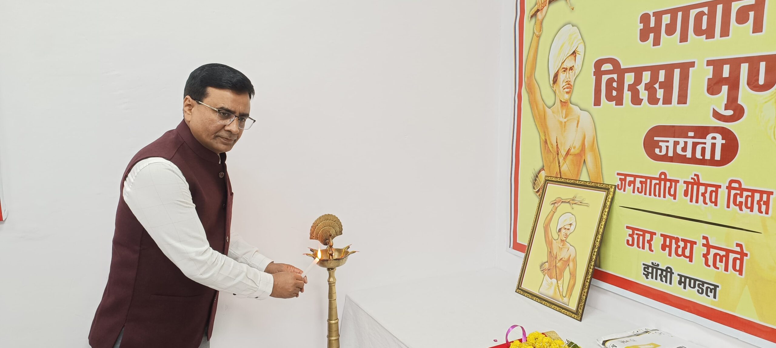 उत्तर मध्य रेलवे, झाँसी मंडल में आज दिनांक 22.11.2024 को धरती आबा भगवान बिरसा मुंडा की जयंती के उपलक्ष्य में मंडल रेल प्रबंधक कार्यालय में चतुर्थ जनजातीय गौरव दिवस मनाया गया। कार्यक्रम का शुभारंभ मंडल रेल प्रबंधक दीपक कुमार सिन्हा ने दीप प्रज्वलन एवं भगवान बिरसा मुंडा के चित्र पर माल्यार्पण कर किया। माल्यार्पण उपरान्त श्री दीपक कुमार सिन्हा ने भगवान बिरसा मुंडा के जीवन व उनके स्वतंत्रता संग्राम में योगदान तथा आदर्शों पर विचार रखे।