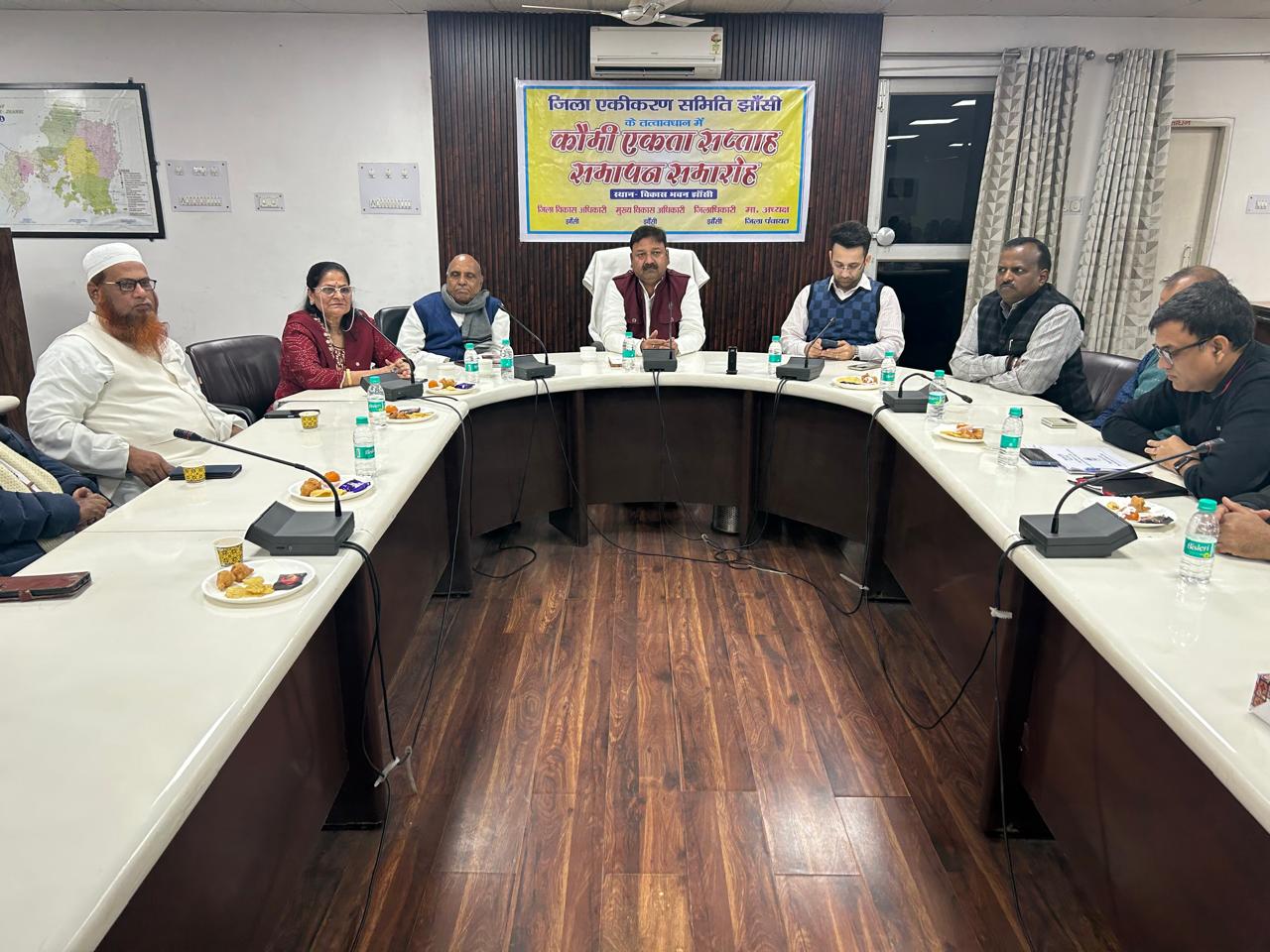 एकीकरण समिति के सदस्यों द्वारा कौमी एकता सप्ताह के समापन समारोह के अवसर पर सप्ताह भर चलनें वाले कार्यक्रमों पर चर्चा की गयी तथा महानविभूतियों द्वारा दिये गये एकता एवं अखण्डता के संदेश के साथ ही उनके सराहनीय कार्यों पर एकीकरण समिति के सदस्य मोहन नेपाली, शहर काजी मुफ्ती साबिर कासमी, हरगोविन्द कुशवाहा, फादर सदानन्द डिसूजा, संजय पटवारी, मीरा रायकवार एवं सुश्री प्रगति शर्मा द्वारा अपनें विचार व्यक्त किये गये। अध्यक्ष द्वारा भी अपनें उदबोधन में एकता की शक्ति का संदेश दिया गया।