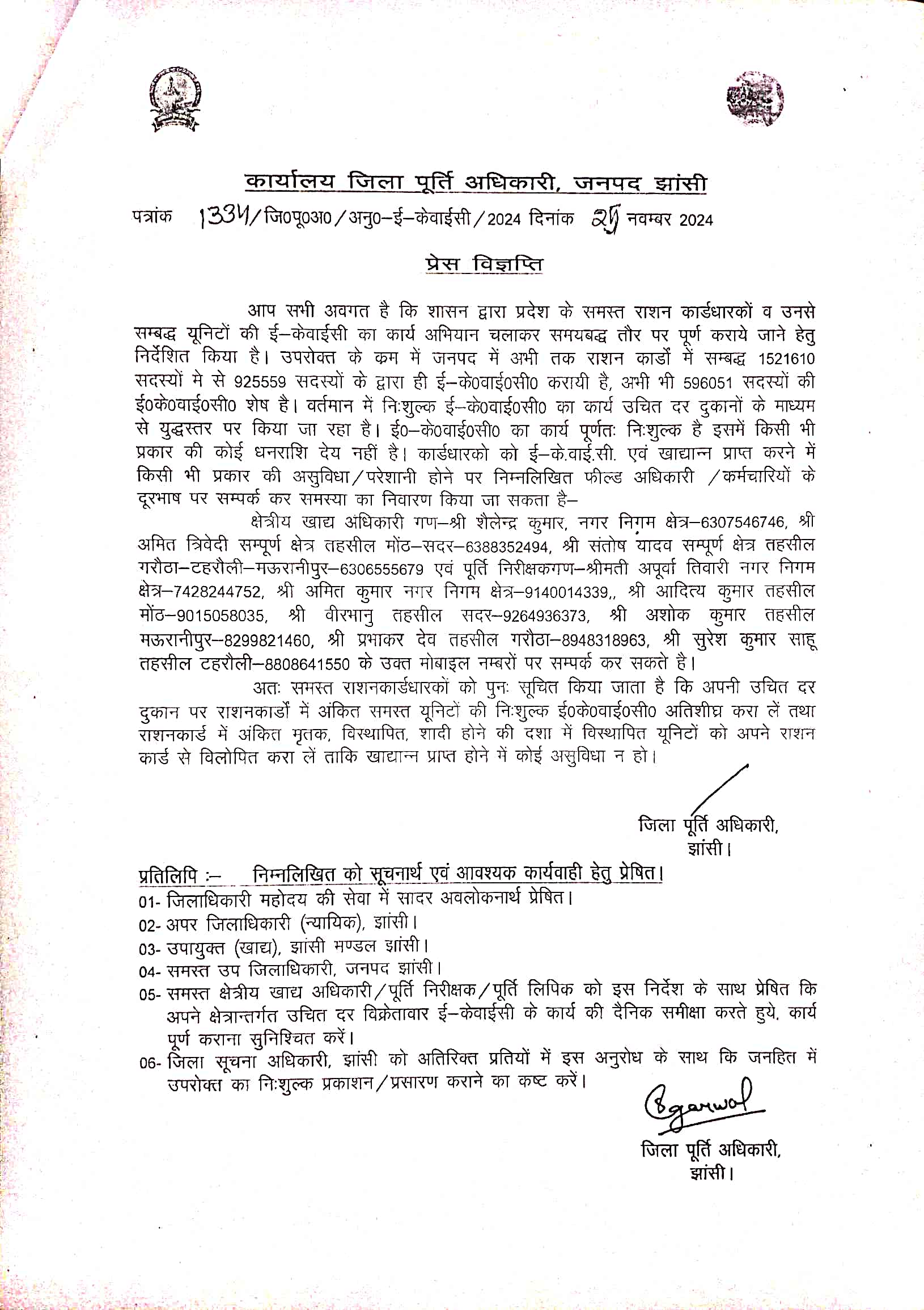 उन्होंने यह भी बताया कि वर्तमान में निःशुल्क ई-के०वाई०सी० का कार्य उचित दर दुकानों के माध्यम से युद्धस्तर पर किया जा रहा है। ई० के०वाई०सी० का कार्य पूर्णतः निःशुल्क है इसमें किसी भी प्रकार की कोई धनराशि देय नहीं है। कार्डधारको को ई-के.वाई.सी. एवं खाद्यान्न प्राप्त करने में किसी भी प्रकार की असुविधा/परेशानी होने पर क्षेत्रीय खाद्य अधिकारी शैलेन्द्र कुमार, नगर निगम क्षेत्र-6307546746, अमित त्रिवेदी सम्पूर्ण क्षेत्र तहसील मोंठ सदर-6388352494, संतोष यादव सम्पूर्ण क्षेत्र तहसील गरौठा-टहरौली-मऊरानीपुर 6306555679 एवं पूर्ति निरीक्षकगण श्रीमती अपूर्वा तिवारी नगर निगम क्षेत्र-7428244752, अमित कुमार नगर निगम क्षेत्र-9140014339, आदित्य कुमार तहसील मोंठ-9015058035, वीरभानु तहसील सदर-9264936373, अशोक कुमार तहसील मऊरानीपुर-8299821460, प्रभाकर देव तहसील गरौठा-8948318963, सुरेश कुमार साहू तहसील टहरौली-8808641550 फील्ड अधिकारी/कर्मचारियों के मोबाइल नम्बरों पर सम्पर्क कर समस्या का निवारण किया जा सकता है।