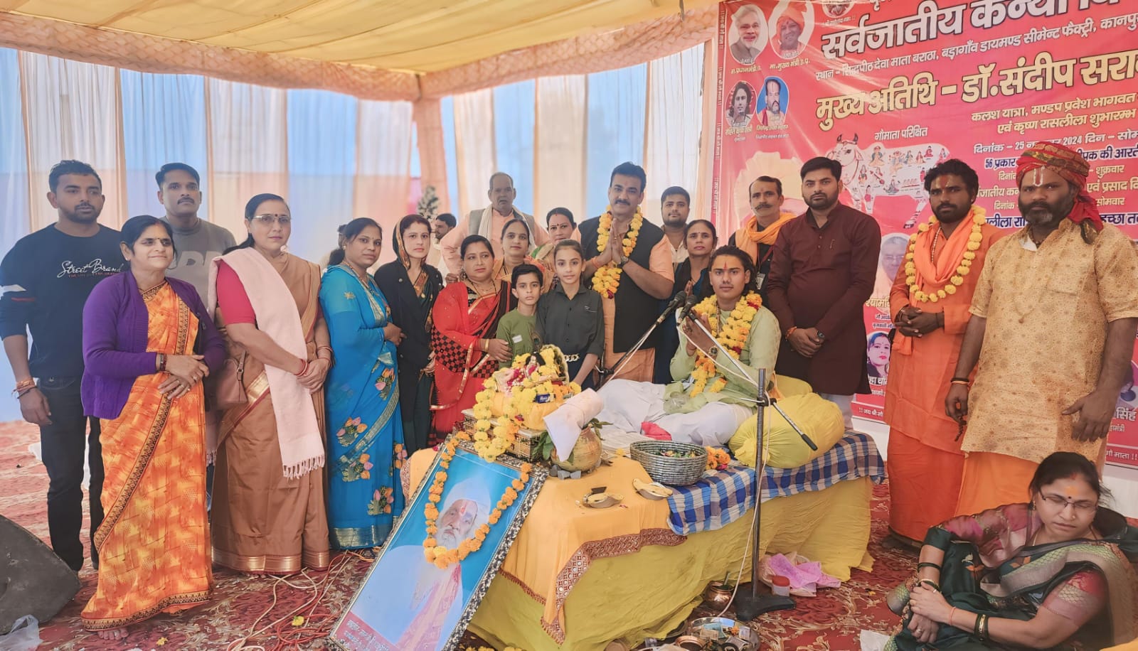 झाँसी। बृजवासी गौ रक्षक सेना भारत संगठन के तत्वाधान में बड़ागांव डायमंड सीमेंट फैक्ट्री के समीप स्थित सिद्धपीठ देवा माता बराठा मंदिर पर सर्वजातीय कन्या विवाह का भव्य आयोजन किया गया। 25 नवंबर से प्रारंभ हुए इस कार्यक्रम में कलश यात्रा के साथ कार्यक्रम की शुरुआत हुई। यह कार्यक्रम 2 दिसंबर को सर्वजातीय कन्या विवाह एवं विशाल भंडारे के साथ समाप्त होगा। दिनांक 28 नवंबर को भागवत कथा का आयोजन किया गया जिसमें कथावाचक के रूप में वृंदावन से पधारे रोहित कृष्ण शास्त्री ने भागवत कथा की महिमा कार्यक्रम में उपस्थित भक्तजनों के समक्ष रखी। इस कार्यक्रम में मुख्य अतिथि के रूप में जनपद की प्रतिष्ठित समाजसेवी डॉ० संदीप सरावगी उपस्थित रहे। मुख्य अतिथि के आगमन पर आयोजक मंडल द्वारा तिलक व माल्यार्पण कर उनका स्वागत किया गया। इस अवसर पर डॉ० संदीप ने कहा गीता के नियमित पाठ से हमारा मन शान्त रहता है, हमारे अंदर के सारे नकारात्मक प्रभाव नष्ट होने लगते हैं, सभी प्रकार की बुराइयों से दूरी स्वतः बनने लगती है और हमारे अंदर का सारा भय दूर हो जाता है जिससे हम निर्भय बन जाते हैं। समय-समय पर श्रीमद् भागवत गीता का पाठ करते रहना चाहिये। इस अवसर पर मुख्य रूप से प्रेम किशोर गंगवार राष्ट्रीय सचिव, बृजेश तिवारी महोबा प्रदेश कॉऑर्डिनेटर, अरविंद सोनी प्रदेश कार्यकारिणी अध्यक्ष, दिलीप भार्गव कानपुर प्रांत संगठन मंत्री, बलराम दास बाबा, पुष्पा देवी गंगवार राष्ट्रीय सचिवालय कार्यालय प्रभारी, नेहा चौबे प्रदेश कार्यकारिणी अध्यक्ष, हेमलता विश्वकर्मा जिला महामंत्री झांसी, सुनीता सोनी प्रदेश सचिव, कुसुम साहू प्रदेश संयोजक, महिला मोर्चा, राजेश्वरी पटेल प्रदेश मंत्री, महिला मोर्चा, प्रकाश माते, महंत जितेंद्र शरण महाराज सिद्ध पीठ महंत देवा माता, रागिनी सिंह व सैकड़ों की संख्या में क्षेत्रीय जन व भक्तगण उपस्थित रहे।