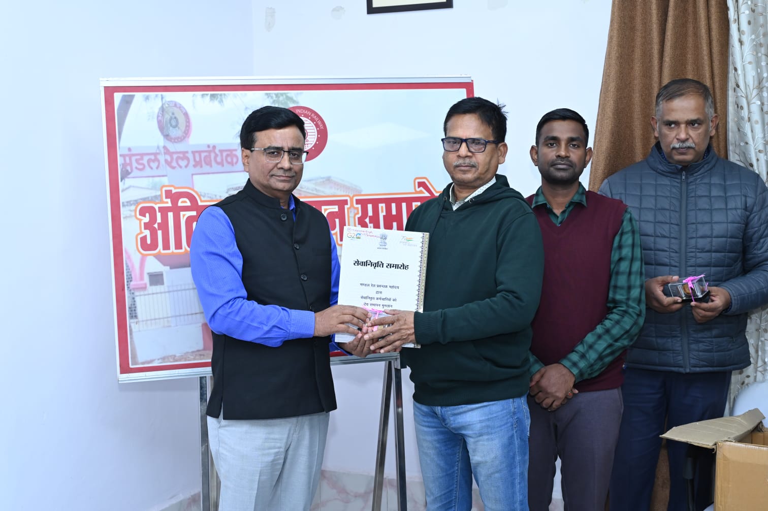 मंडल रेल प्रबंधक ने इस अवसर पर सभी सेवानिवृत होने वाले कर्मचारियों को भारतीय रेल में उनकी लम्बी अवधि की सफलतम सेवा के लिये बधाई एवं शुभकामनाएँ दी तथा स्वास्थ्य और सुखद व मंगलमय भविष्य की कामना की । सेवानिवृत होने वाले कर्मचारियों को विदाई देते हुए यह भी आश्वासन दिया गया कि उनकी सेवानिवृत्ति के उपरान्त भी वे रेल परिवार का हिस्सा रहेंगे।