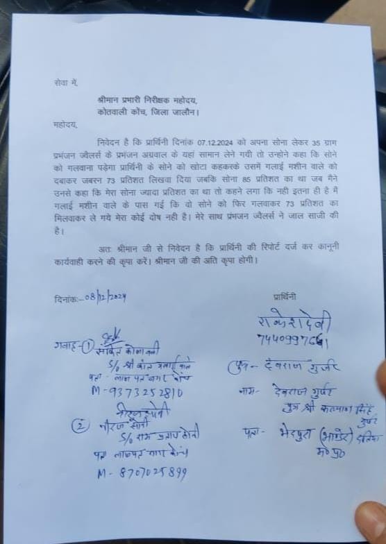 प्राप्त जानकारी के अनुसार भेदपुरा जिला दतिया के देवराज गुर्जर पुत्र कल्याण सिंह एवं मां राकेश देवी ने कोंच कोतवाली पुलिस को शिकायती पत्र देते हुए बताया कि दिनांक 07 दिसंबर को कोंच नगर के रामगंज बाजार स्थित प्रभंजन ज्वैलर्स पर 35 ग्राम सोने के जेवरात बेचने गया तो प्रभंजन ज्वैलर्स के मालिक प्रभंजन अग्रवाल ने मेरे जेवरात को गलाया और बताया कि 73% सोना है जबकि मेरे सोने का सही 85% था जब मैने गलाई वाले से कहा तो उसने बतलाया कि प्रभंजन ज्वैलर्स के कहने पर मैने 85 % का 73 % लिखा। मेरे सोने का सही टंच बतलाओ तो कहा कि तुम्हारे सोने का 73% का ही है। प्रभंजन ज्वैलर्स ने मेरे साथ धोखाधड़ी की है कृपया रिपोर्ट दर्ज कर कानूनी कार्यवाही करे। मामले में प्रभारी निरीक्षक कोंच अरुण कुमार राय ने कहा कि शिकायत की जांच की जा रही है, जांच उपरांत विधिक कार्यवाही की जाएगी।