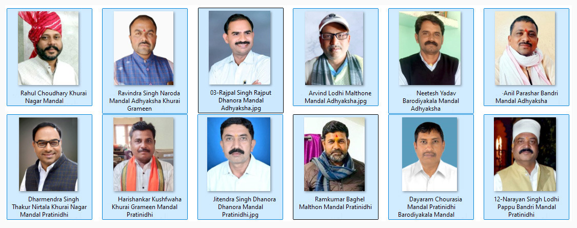 उल्लेखनीय है कि इस बार दो नये भाजपा मंडल खुरई क्षेत्र में बनाए गए हैं जिनके अध्यक्ष व प्रतिनिधियों के चुनाव भी कराए गए हैं। विधानसभा क्षेत्र के 4 पुराने व दो नये मंडलों में निर्वाचित हुए अध्यक्षों की सूची के अनुसार भाजपा खुरई नगर मंडल अध्यक्ष चौधरी राहुल जैन, खुरई ग्रामीण मंडल अध्यक्ष रवीन्द्र सिंह राजपूत (नरोदा), धनौरा मंडल अध्यक्ष राजपाल सिंह राजपूत (सिंगपुर), बांदरी मंडल अध्यक्ष अनिल पाराशर (झीकनी), बरोदियां कलां मंडल अध्यक्ष नीतेश यादव (प्रेमपुरा), मालथौन मंडल अध्यक्ष अरविंद सिंह लोधी (रामछायरी) शामिल हैं। निर्वाचित भाजपा मंडल प्रतिनिधियों की सूची में खुरई नगर मंडल प्रतिनिधि धर्मेन्द्र सिंह (निर्तला) खुरई ग्रामीण मंडल प्रतिनिधि हरिशंकर कुशवाहा (मुकारमपुर), धनौरा मंडल प्रतिनिधि जितेंद्र सिंह (धनौरा), मालथौन मंडल प्रतिनिधि रामकुमार बघेल (खरैरा), बरोदिया कलां मंडल प्रतिनिधि दयाराम चौरसिया (बरोदिया), बांदरी मंडल प्रतिनिधि नारायण लोधी (पप्पू मुकद्म बांदरी) शामिल हैं।