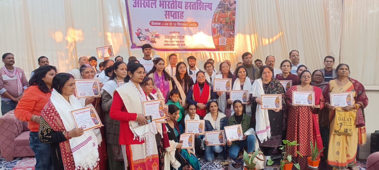 गत वर्षों की भाँति इस वर्ष भी दिनाँक 08 दिसम्बर 2024 से “अखिल भारतीय हस्तशिल्प सप्ताह” का आयोजन जिला उद्योग केन्द्र कार्यालय में किया जा रहा, जिसका समापन आज जिला आकांक्षा समिति की अध्यक्षा श्रीमती प्रीति सिंह के मुख्य आतिथ्य में किया गया। उक्त सप्ताह के दौरान हस्तशिल्पियों की गोष्ठी एवं प्रतियोगिताओं को आयोजन किया गया। साथ ही जनपद के हस्तशिल्पियों द्वारा अपने उत्कृष्ट उत्पादों की प्रदर्शनी लगाई गई। प्रदर्शनी का अवलोकन आकांक्षा समिति की अध्यक्षा जिलाधिकारी महोदय की धर्मपत्नी श्रीमती प्रीति सिंह तथा नगर आयुक्त महोदय, नगर निगम की धर्मपत्नी कामिनी द्वारा किया गया तथा अतिथिगणों द्वारा प्रदर्शनी का अवलोकन करते हुए हस्तशिल्पियों के उत्पादों की सराहना की गई।
