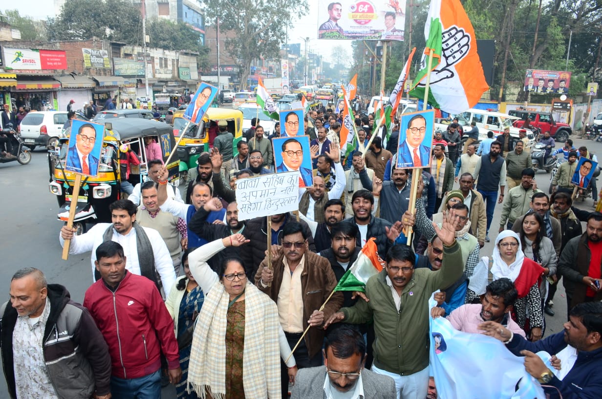 झांसी: आज भारत रत्न संविधान निर्माता डॉ. भीमराव अंबेडकर जी के खिलाफ केंद्रीय गृहमंत्री अमित शाह द्वारा की गई आपत्तिजनक टिप्पणी के विरोध में कांग्रेस के राष्ट्र व्यपी बाबा साहब डा. अम्बेडकर सम्मान मार्च का शुभारम्भ पूर्व केंद्रीय मंत्री प्रदीप जैन आदित्य ने डा. अम्बेडकर पार्क कचहरी चौराहा स्थित बाबा साहब की प्रतिमा का दूध से अभिषेक व माल्यार्पण का किया। तत्पश्चात जिलाध्यक्ष योगेन्द्र सिंह पारीछा के नेतृत्व में सैकड़ों की संख्या में कांग्रेस जनों ने पैदल मार्च किया और महामहिम राष्ट्रपति को संबोधित ज्ञापन जिलाधिकारी को भेंट किया। जिसमें अमित शाह के खिलाफ कार्यवाही किये जाने की मांग की।