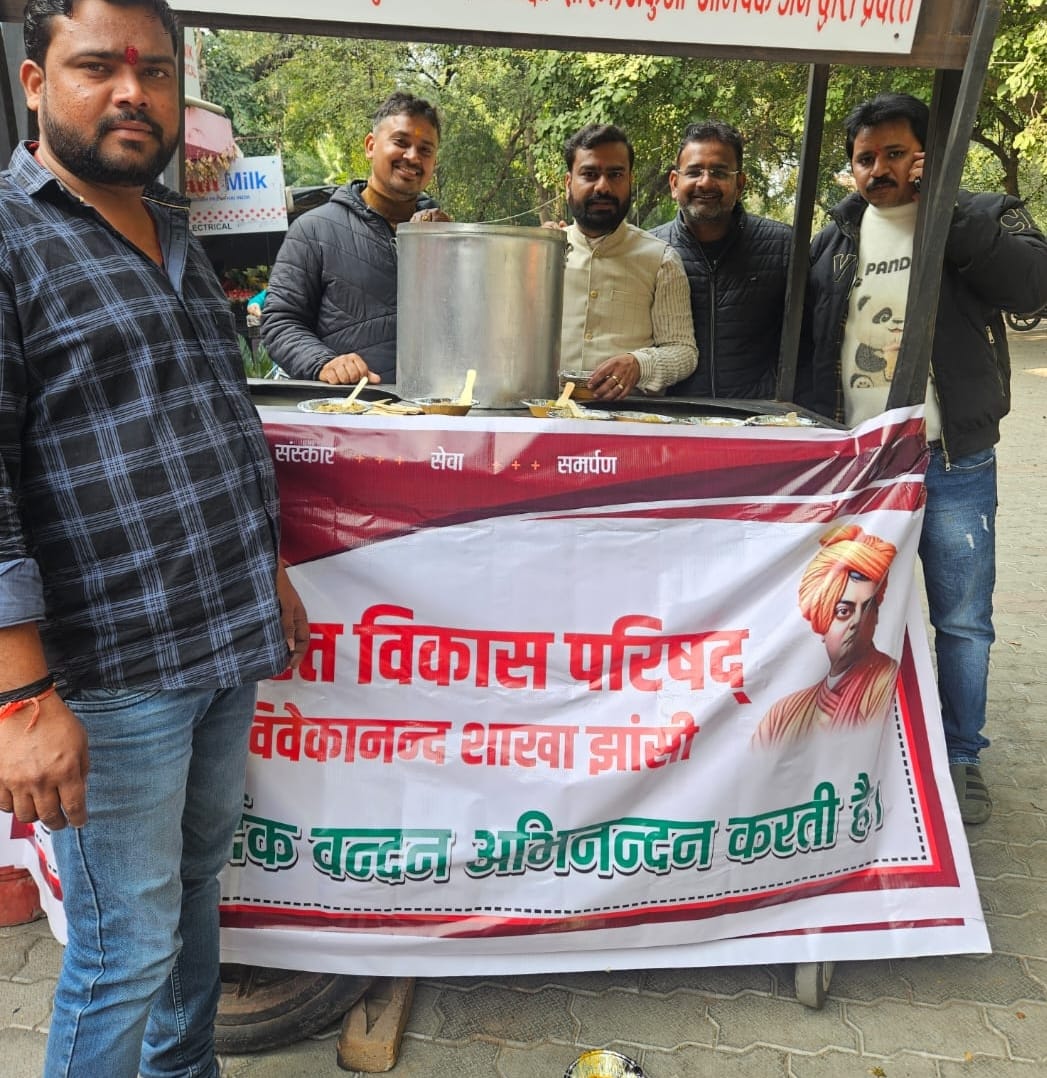 झांसी:- मकर संक्रांति के अवसर पर भारत विकास परिषद् विवेकानन्द शाखा के तत्वावधान एवं अध्यक्ष सौरभ जैन सर्वज्ञ के नेतृत्व में मेडिकल कॉलेज के प्रांगण में सामाजिक समरसता का प्रतीक खिचड़ी भोज आयोजित किया गया जिसमें मरीजों, तीमारदारों एवं आम राहगीरों को खिचड़ी वितरित की गई। इस अवसर पर संस्था के संरक्षक वरुण जैन, उपाध्यक्ष एंजी. विकल्प जैन, कोषाध्यक्ष सजल जैन चैनू, परनतप शर्मा, गौरव चौधरी, अंशुल जैन, गौरव जैन नीम, अंकित शर्मा आदि उपस्थित रहें।