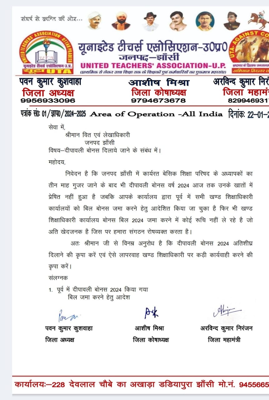 जनपद झाँसी में कार्यरत बेसिक शिक्षा परिषद के अध्यापकों का तीन माह गुजर जाने के बाद भी दीपावली बोनस वर्ष 2024 आज तक उनके खातों में प्रेषित नहीं हुआ है जबकि आपके कार्यालय द्वारा पूर्व में सभी खण्ड शिक्षाधिकारी कार्यालयों को बिल बोनस जमा करने हेतु आदेशित किया जा चुका है फिर भी खण्ड शिक्षाधिकारी कार्यालय बोनस बिल 2024 जमा करने में कोई रूचि नहीं ले रहे है जो अति खेदजनक है जिस पर हमारा संगठन रोषव्यक्त करता है।