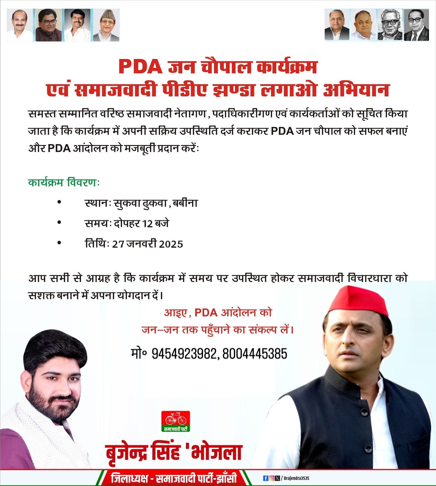 समस्त सम्मानित वरिष्ठ समाजवादी नेतागण, पदाधिकारीगण एवं कार्यकर्ताओं को सूचित किया जाता है कि राष्ट्रीय अध्यक्ष अखिलेश यादव जी के आदेशानुसार कार्यक्रम में अपनी सक्रिय उपस्थिति दर्ज कराकर PDA जन चौपाल को सफल बनाएं और PDA आंदोलन को मजबूती प्रदान करें: