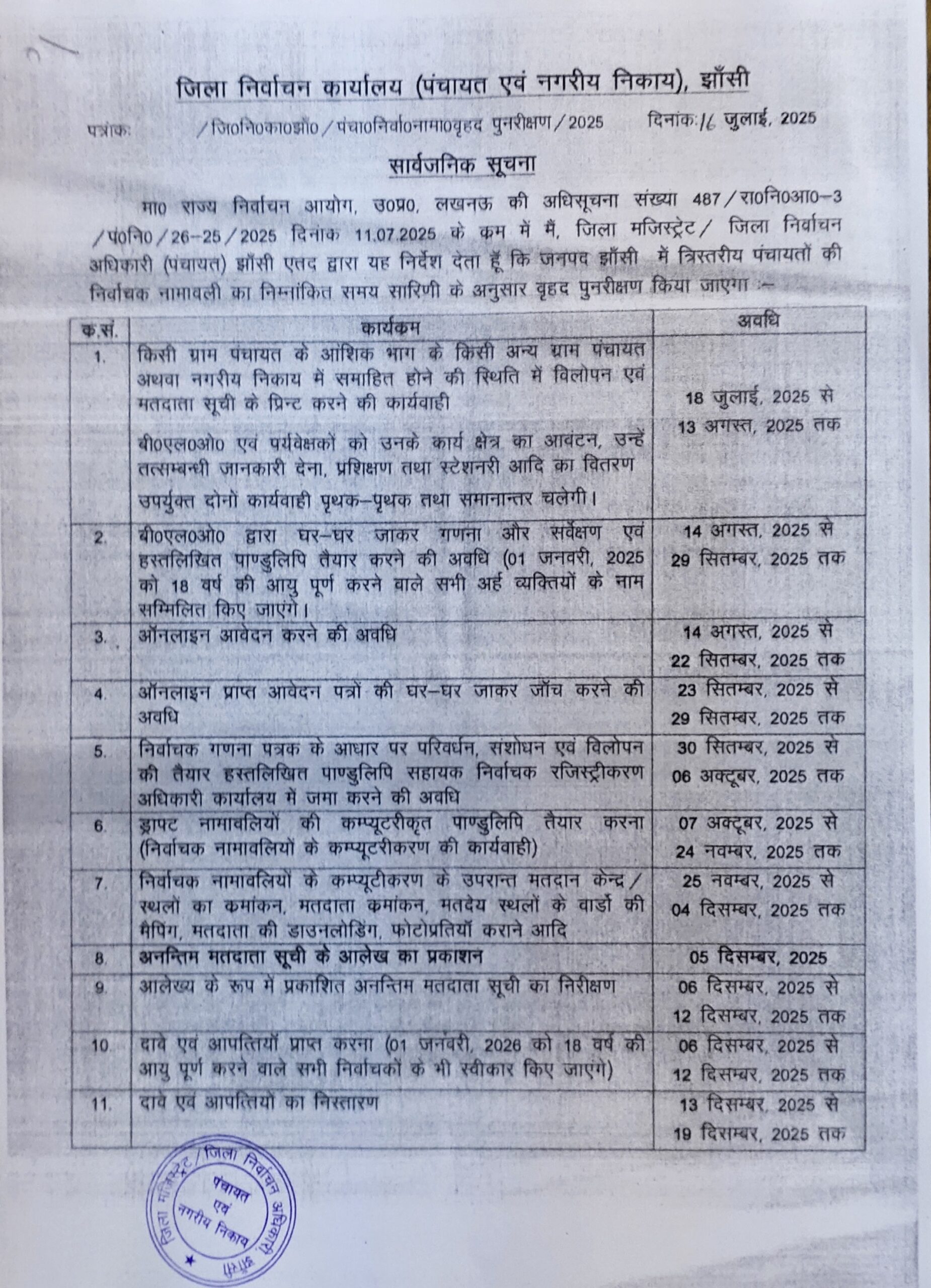 झांसी : जिला मजिस्ट्रेट /जिला निर्वाचन अधिकारी (पंचायत एवं नगरीय निकाय) ने अवगत कराया है कि मा० राज्य निर्वाचन आयोग, उ0प्र0, लखनऊ के निर्देशानुसार जनपद झाँसी में त्रिस्तरीय पंचायतों की निर्वाचक नामावली की समय सारिणी के अनुसार वृहद पुनरीक्षण किया जाएगा, जिसके अंतर्गत किसी ग्राम पंचायत के आंशिक भाग के किसी अन्य ग्राम पंचायत अथवा नगरीय निकाय में समाहित होने की स्थिति में विलोपन एवं मतदाता सूची के प्रिन्ट करने की कार्यवाही एवं बीएलओ एवं पर्यवेक्षकों को उनके कार्य क्षेत्र का आवंटन, उन्हें तत्सम्बन्धी जानकारी देना, प्रशिक्षण तथा स्टेशनरी आदि का वितरण उपर्युक्त दोनों कार्यवाही पृथक-पृथक तथा समानान्तर दिनांक 18 जुलाई से 13 अगस्त 2025 तक चलेगी। दिनांक 14 अगस्त से 29 सितम्बर 2025 तक बीएलओ द्वारा घर-घर जाकर गणना और सर्वेक्षण एवं हस्तलिखित पाण्डुलिपि तैयार करने की अवधि (01 जनवरी, 2025 को 18 वर्ष की आयु पूर्ण करने वाले सभी अर्ह व्यक्तियों के नाम सम्मिलित किए जाएंगे। ऑनलाइन आवेदन करने की अवधि दिनांक 14 अगस्त से 22 सितम्बर 2025 तक है। ऑनलाइन प्राप्त आवेदन पत्रों की घर-घर जाकर जाँच करने की अवधि दिनांक 23 सितम्बर से 29 सितम्बर 2025 तक होगी। निर्वाचक गणना पत्रक के आधार पर परिवर्धन, संशोधन एवं विलोपन की तैयार हस्तलिखित पाण्डुलिपि सहायक निर्वाचक रजिस्ट्रीकरण अधिकारी कार्यालय में जमा करने की अवधि 30 सितम्बर से 06 अक्टूबर 2025 तक होगी। दिनांक 07 अक्टूबर से 24 नवम्बर 2025 तक ड्रापट नामावलियों की कम्प्यूटरीकृत पाण्डुलिपि तैयार करना (निर्वाचक नामावलियों के कम्प्यूटरीकरण की कार्यवाही)। निर्वाचक नामावलियों के कम्प्यूटीकरण के उपरान्त मतदान केन्द्र /स्थलों का कमांकन, मतदाता कमांकन, मतदेय स्थलों के वार्डो की मैपिंग, मतदाता की डाउनलोडिंग, फोटोप्रतियाँ कराने आदि कार्य दिनांक 25 नवम्बर से 04 दिसम्बर 2025 तक किये जायेंगे।
