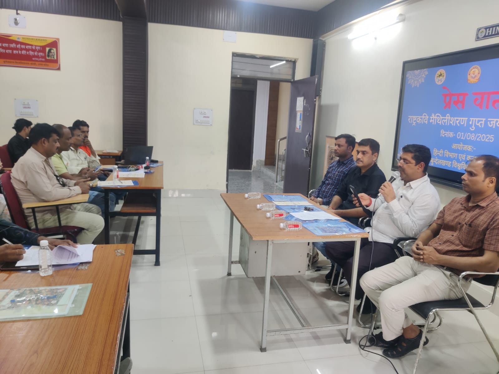 प्रेस वार्ता को हिंदी विभाग के अध्यक्ष प्रो मुन्ना तिवारी द्वारा संबोधित किया गया। इस अवसर पर राष्ट्रकवि मैथिलीशरण गुप्त के पौत्र वैभव गुप्त, डॉ श्रीहरि त्रिपाठी, डॉ बिपिन प्रसाद, डॉ कौशल त्रिपाठी, डॉ प्रेमलता श्रीवास्तव, डॉ सुधा दीक्षित, डॉ रेनू शर्मा, डॉ पूजा निरंजन, डॉ सुनीता वर्मा, गरिमा, रिचा, जोगिंदर, आकांक्षा सिंह, मनीष मंडल उपस्थित रहे।