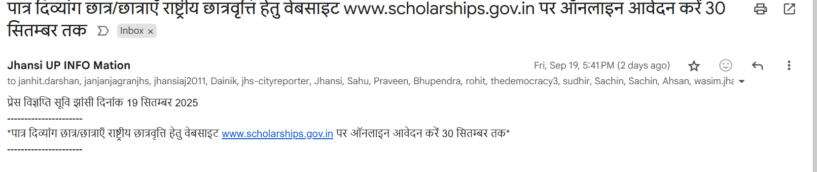 पात्र दिव्यांग छात्र/छात्राएँ राष्ट्रीय छात्रवृत्ति हेतु वेबसाइट www.scholarships.gov.in पर ऑनलाइन आवेदन करें 30 सितम्बर तक