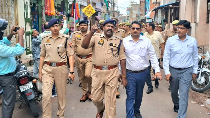 जिलाधिकारी श्री मृदुल चौधरी और वरिष्ठ पुलिस अधीक्षक श्री बी0 बी0 जी0 टी0 एस0 मूर्ति ने पुलिस बल के साथ शहर के शहर के प्रमुख मस्जिद मार्गों परकिया पैदल भ्रमण एवं अन्य संवेदनशील इलाकों का दौरा किया।