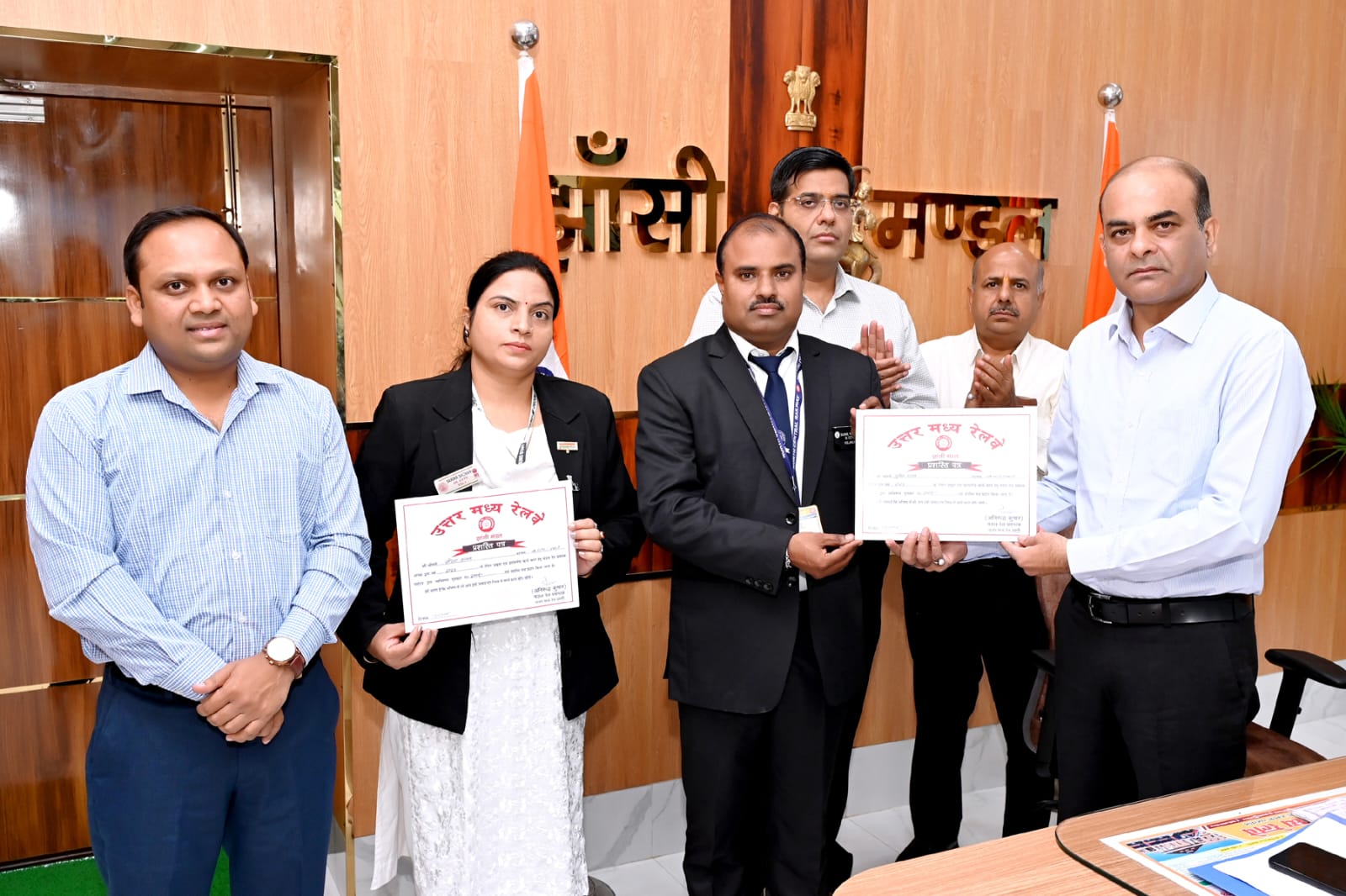 मंडल प्रशासन द्वारा दोनों रेलकर्मियों की इस उत्कृष्ट सेवा भावना, मानवीय संवेदना एवं तत्परता को सराहनीय बताते हुए वरिष्ठ मंडल वाणिज्य प्रबंधक श्री अमन वर्मा की संस्तुति पर मंडल रेल प्रबंधक श्री अनिरुद्ध कुमार द्वारा उन्हें नकद पुरस्कार एवं विशिष्ट सेवा प्रमाण-पत्र प्रदान कर सम्मानित किया गया। इस अवसर पर अपर मंडल रेल प्रबंधक (इन्फ्रा) श्री प्रेम प्रकाश शर्मा एवं अपर मंडल रेल प्रबंधक (परिचालन) श्री नन्दीश शुक्ल उपस्थित रहे I
