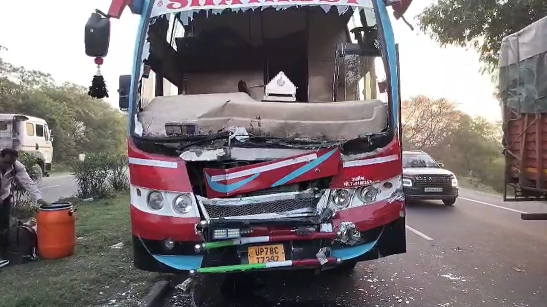 शताब्दी बस कंटेनर से टकराई, कई यात्री घायल — यात्रियों का आरोप, चालक था नशे में
