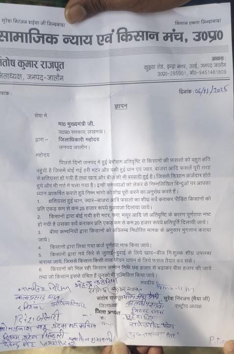 किसानों ने मुख्यमंत्री योगी आदित्यनाथ के नाम ज्ञापन सिटी मजिस्ट्रेट राजेश वर्मा को सौंपा। ज्ञापन में किसानों ने बताया कि हाल ही में हुई अतिवृष्टि और ओलावृष्टि से हरी मटर, चना, मसूर, ज्वार, बाजरा, धान जैसी फसलें पूरी तरह बर्बाद हो गईं, जिससे उन्हें भारी आर्थिक नुकसान उठाना पड़ा है।