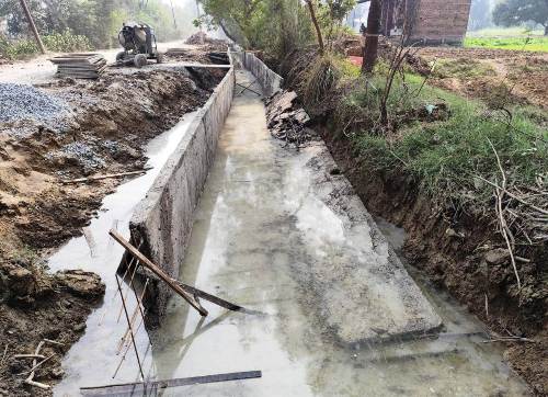 स्थानीय लोगों का आरोप — पानी भरे नाले में ही डाल दी गई आरसीसी बेडिंग